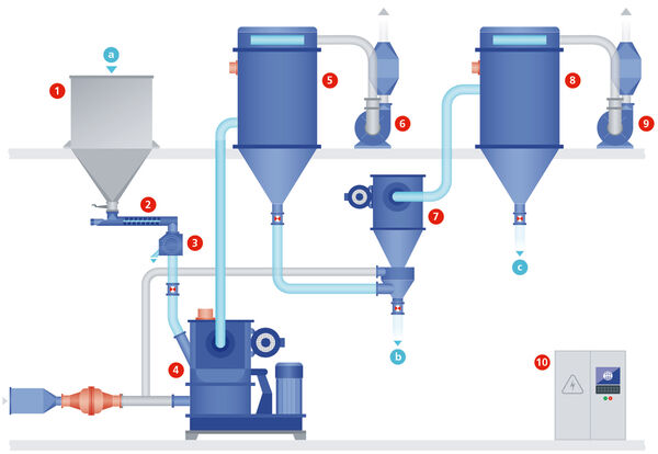 1. Phễu nạp liệu 2. Vít tải nạp liệu 3. Máy tách kim loại 4. Máy nghiền kim loại CW II 5. Máy phân ly khí ATP 6. Bộ lọc tự động 7. Quạt 8. Tủ điều khiển (a) Sản phẩm nạp liệu (b) Phân đoạn chứa ít protein (c) Phân đoạn chứa nhiều protein