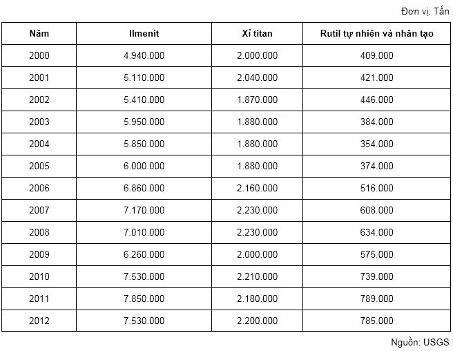 Bảng 1. Sản lượng ilmenit, xỉ và rutil (tự nhiên và nhân tạo) toàn cầu