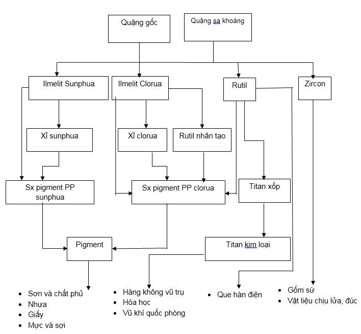 Quặng titan thông thường được khai thác từ 2 dạng quặng chính là quặng sa khoáng ven biển và quặng gốc. Quặng titan thường được chế biến và sử dụng rộng rãi trong nhiều ngành công nghiệp khác nhau như: Pigment, Titan kim loại và hợp kim của chúng vv… (Hình 1). Trên thế giới có khoảng 90% titan sử dụng ở dạng pigment TiO2, chính là oxit TiO2. Nguyên liệu đầu vào cho ngành titan trong một số năm qua thể hiện tại Bảng 1.