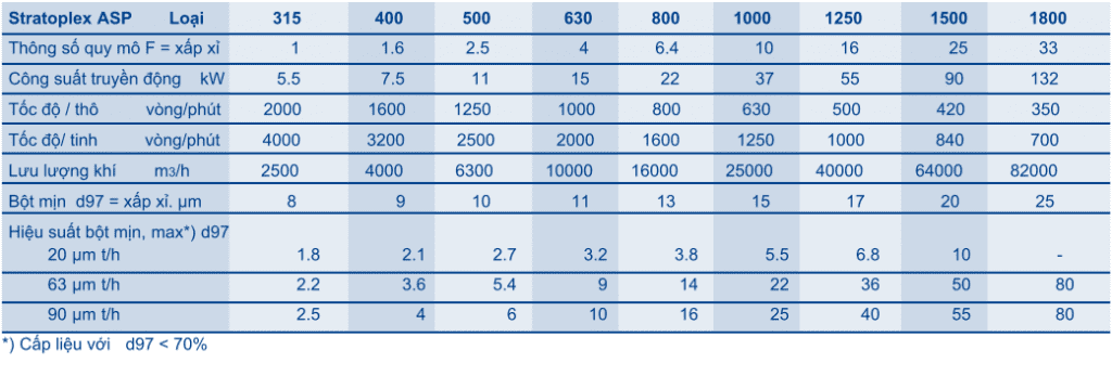 = 20 – 200 µm. Máy phân ly Stratoplex hiệu quả về chi phí đặc trưng bởi độ chính xác cao,năng suất bột mịn cao, tiêu thụ điện năng thấp và dễ dàng điều chỉnh.